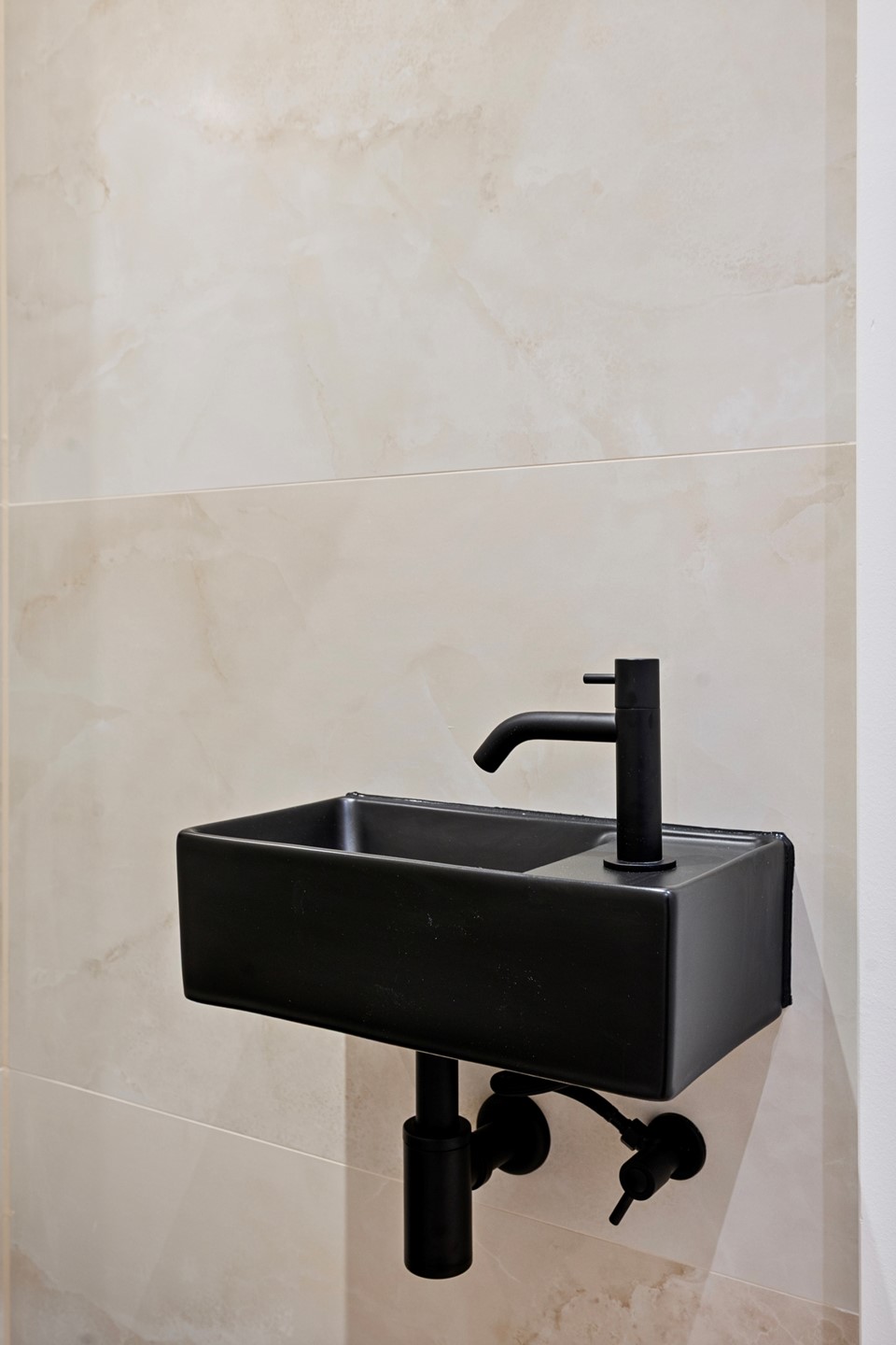 De badkamer is een absolute blikvanger: hoogwaardig afgewerkt met grote marmerlook tegels, een ruime inloopdouche met inbouwkranen, dubbele natuurstenen waskommen en verlichte spiegels. Een plek waar je iedere dag tot rust komt.