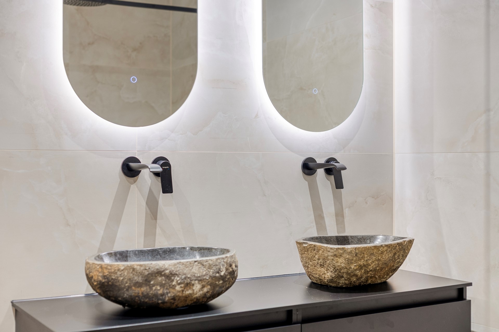 - Luxe badkamer met inloopdouche, inbouwkranen, grote tegels, dubbele waskommen en verlichte spiegels